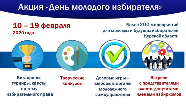 Просветительская акция в честь Дня молодого избирателя пройдет в Курской области с 10 по 19 февраля 2020 года. Школьники и студенты станут участниками правовых викторин, турниров, квестов, творческих конкурсов на тему выборов. Молодые и будущие избиратели в формате открытого диалога встретятся с представителями власти, депутатами, членами избирательных комиссий.
